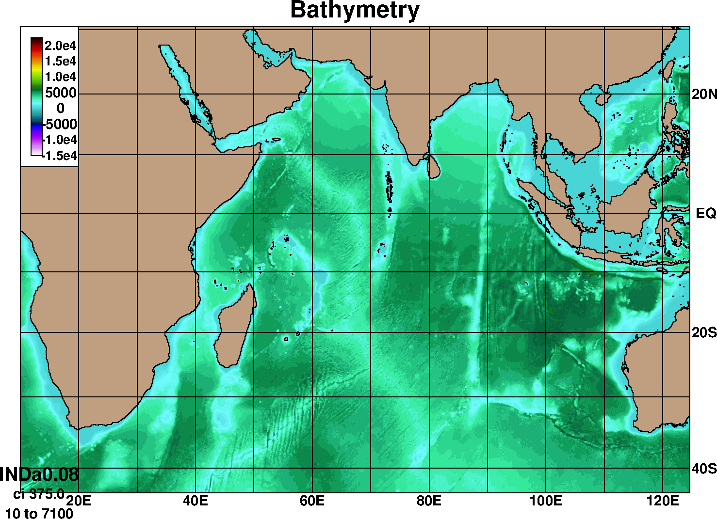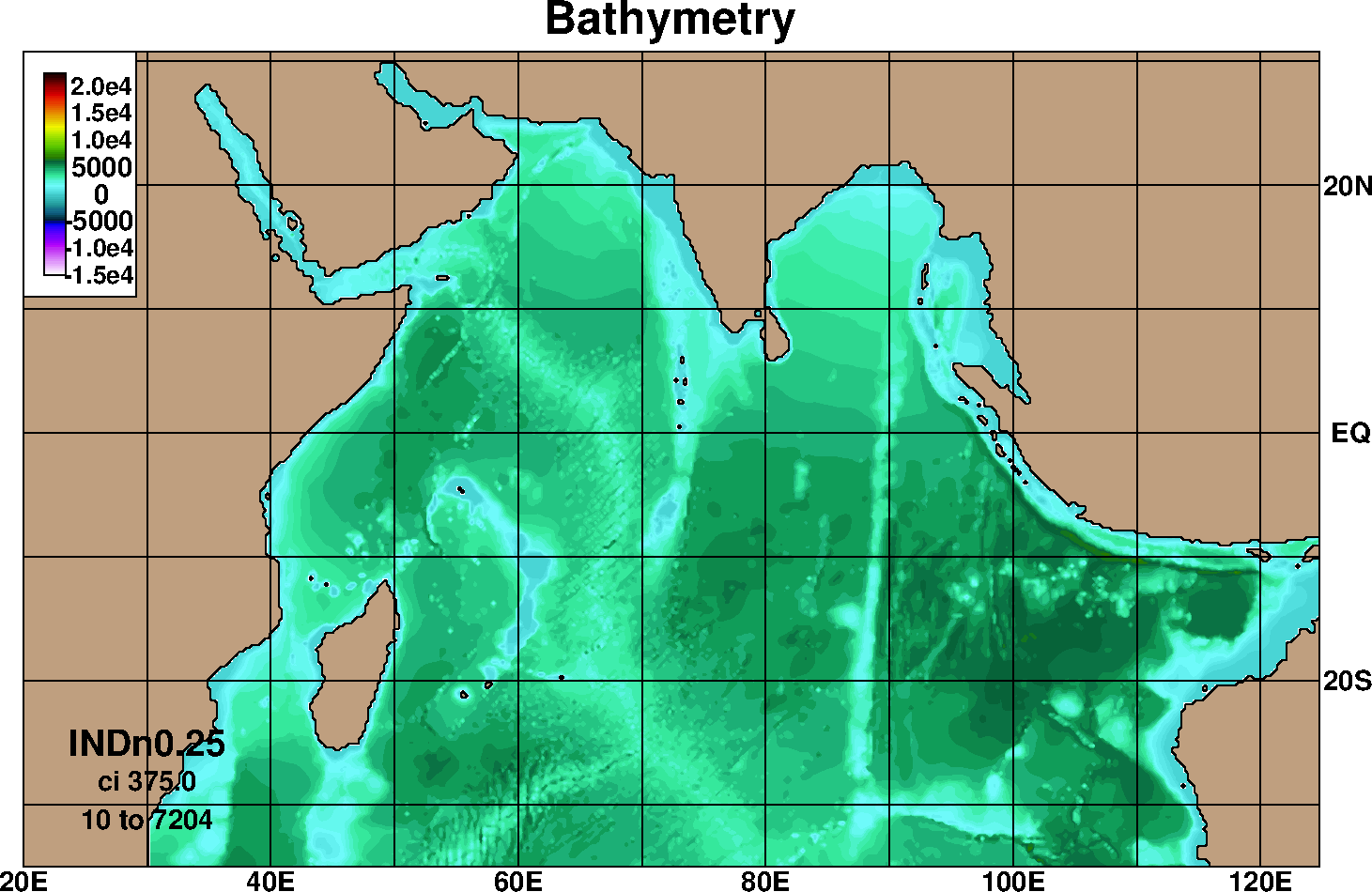 In this first setup model has longitude limits of 20E - 125E and latitude limits of 35S - 31N, with a 0.25ox0.25o horizontal resolution and has hybrid vertical coordinates, which is isopycnal in the open, interior,  stratified ocean, while using a z-level coordinate in the mixed layer. The configuration has 28 hybrid layers in vertical and uses nonlocal K-profile parameterization (KPP) as the boundary layer mixing scheme (Large1994). It has river run off included using the Naval Research Laboratory's monthly climatology (Barron2002). The model uses Levitus climatology for the thermo haline fields and General Bathymetric Chart of the Oceans (GEBCO) bathymetry for bottom topography. The model is relaxed to climatology at southern and eastern boundaries with 50 E-folding days. This setup has been used to simulate Indian Ocean for the period starting from 2003 with NOGAPS 3 hourly atmospheric forcing parameters. The model simulations have been validated against observations and the details are available at validation section.