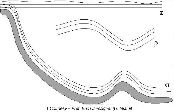 HYCOM (Bleck 2002) is a primitive equation general circulation model which is isopycnal in the open, stratified ocean, but uses the layered continuity equation to make a dynamically smooth transition to a terrain following coordinate in shallow coastal regions, and to z-level coordinates in the mixed layer and/or un-stratified seas. It maintains the significant advantages of an isopycnal model in stratified regions while allowing more vertical resolution near the surface and in shallow coastal areas, hence providing a better representation of the upper ocean physics.  An ideal numerical ocean model should retain its water mass characteristics for centuries (typically done by isopycnic coordinates), have high vertical resolution in the surface mixed layer and maintain sufficient vertical resolution in un-stratified or weakly stratified regions of the ocean (typical nature of depth coordinates), and have high vertical resolution in coastal regions (attained by terrain following coordinates). HYCOM is designed to provide a major advantage over the existing operational global ocean prediction systems, by integrating all the required characteristics of above oceanic realms and it overcomes design limitations of the present systems as well as limitations in vertical and horizontal resolution to a great extent.